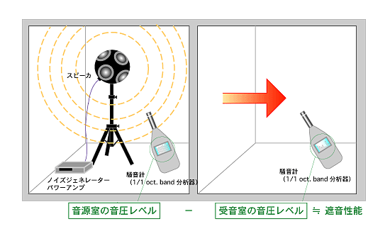 2 室間の D 値は、片方の室で発生させたノイズの音量がもう一方の室でどのぐらい減衰しているかを周波数(音の高さ)別に調べることで得られます。ノイズを発生させている室を音源室と呼び、もう一方の室を受音室と呼びます。